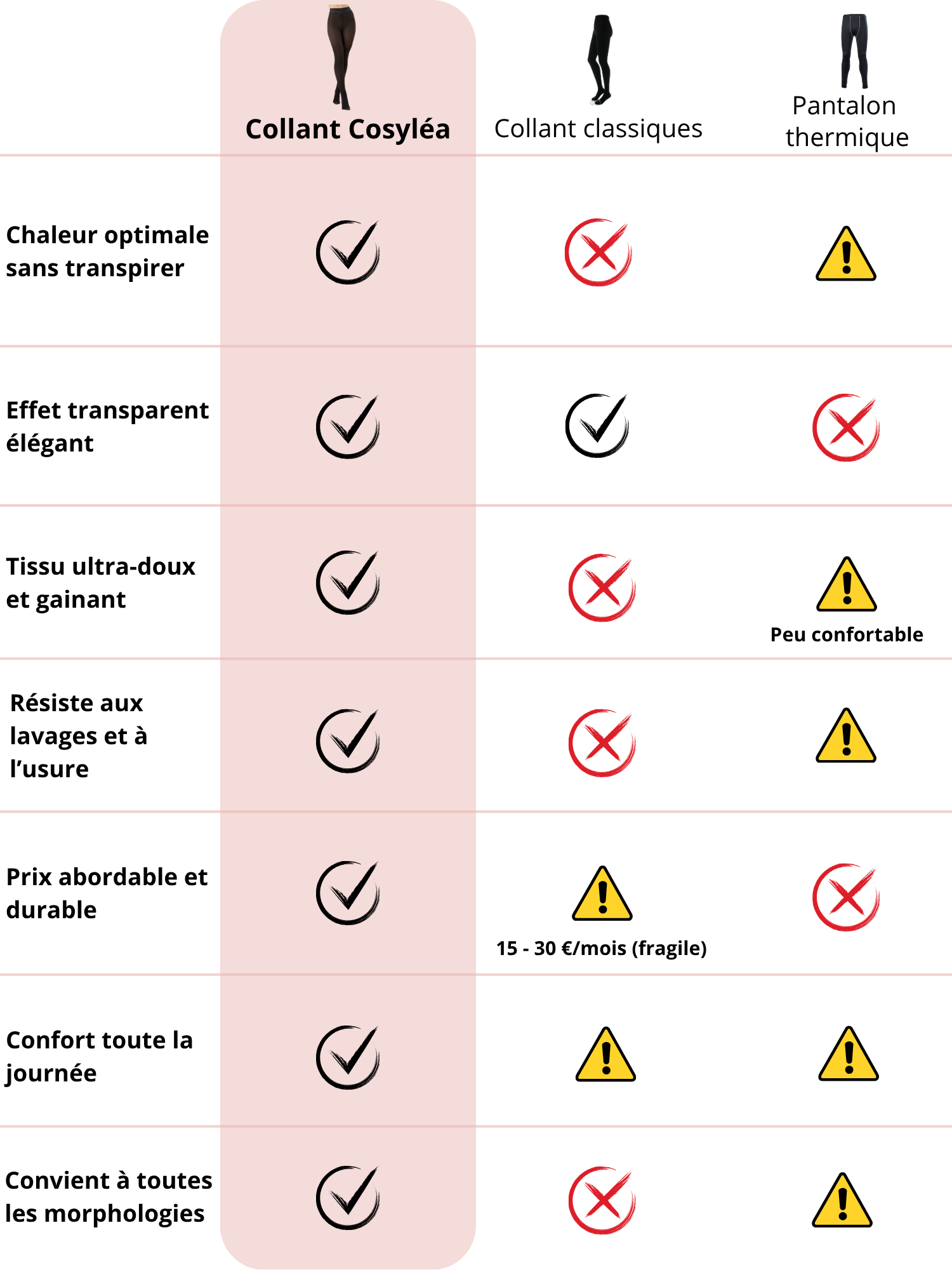 "Ces collants sont incroyables ! Ils sont hyper chauds sans être épais, je peux les porter sous une robe sans que ça se voie. L’intérieur est tout doux, on se sent vraiment bien dedans. J’avais peur qu’ils se détendent, mais ils restent parfaits après plusieurs lavages."