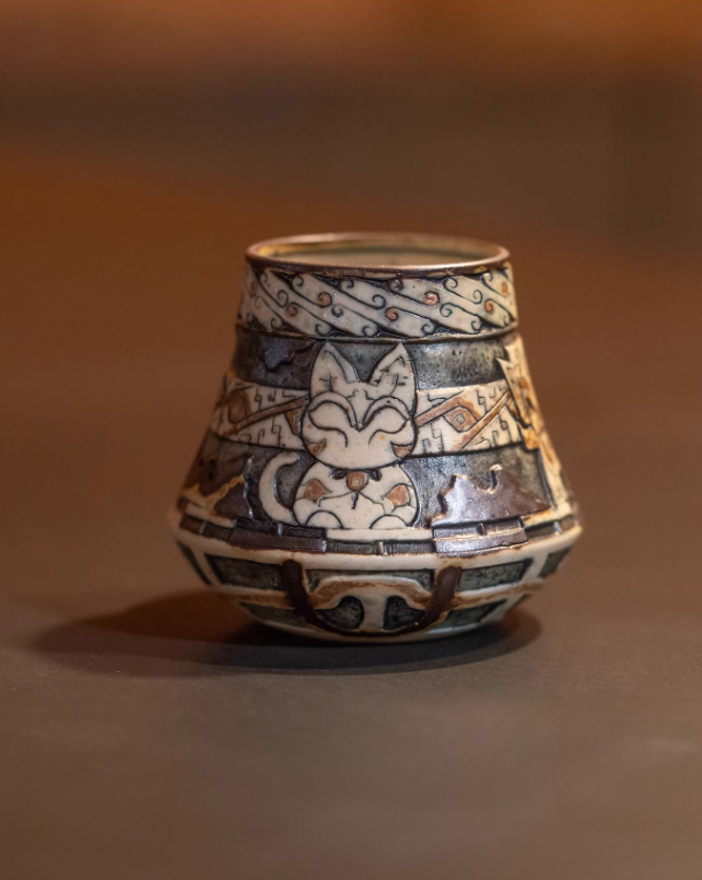 This volcano-shaped mug showcases a hand-carved blue floral cat motif under a translucent glaze. Each piece is a miniature work of art with subtle texture and intricate detailing.